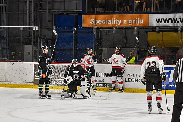 Sezona 2025/26 je čtvrtá v řadě, v níž hokejoví Orli Znojmo (v bílém) působí v českých soutěžích – v tomto případě ve 2. lize. Na snímku přípravný zápas s Hodonínem.