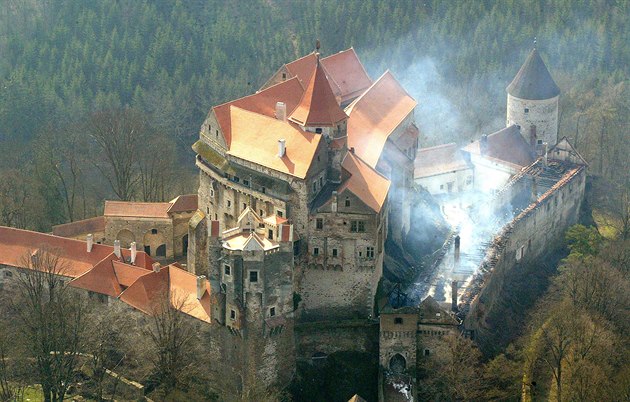 Požár střechy hradu Pernštejn (15. dubna 2005)
