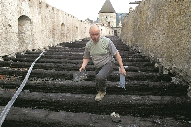 Požár na Pernštejně řádil 15. dubna 2005.