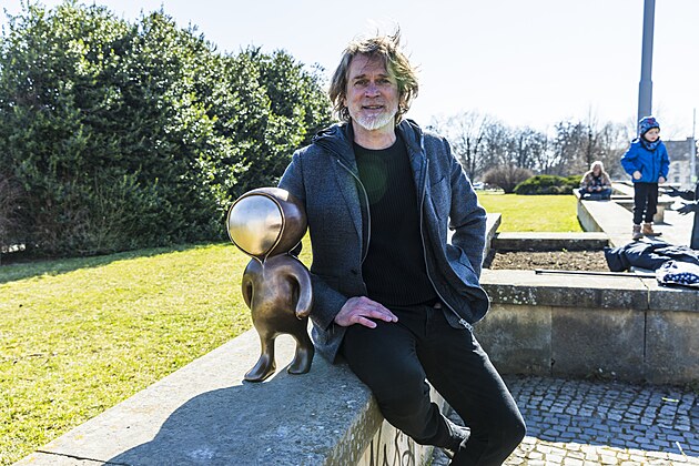 Nedaleko brněnské hvězdárny přibyla další soška mimozemšťana Fegurda. Jejím autorem je Václav Kostohryz - na snímku. (20. března 2025)