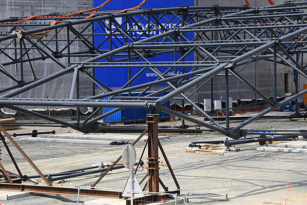 Na multifunkční arénu, která roste na brněnském výstavišti, usadil obří jeřáb ocelovou střešní konstrukci. (12. května 2025)