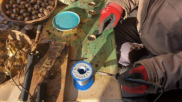 Zbytek výroby se odehrává přímo na trzích. „Nejprve musím zbrousit spojovací plochy, aby byly rovné, a na ně nanesu cín. Nakonec do rolničky vložím matičku a pod plamenem nechám rozpustit cín, aby se obě půlky spojily,“ odhaluje zvonař.