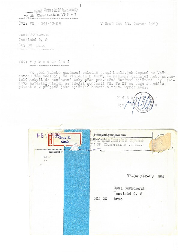 Odpověď SNB disidentce Janě Soukupové na podnět k prošetření urážlivých anonymních dopisů, které dostávala. (1989)