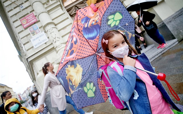 Na náměstí Republiky ve Znojmě byly v úterý roušky povinné i pro rodiče, jinde nasazovali ústenky dobrovolně, třeba na základní škole v brněnské Rašínově ulici.