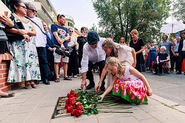 Mosazné kostky v dlažbě, nazvané Kameny zmizelých, připomínají v Brně členy rodin Tugendhat, Hože a Löw-Beer. Kvůli svým židovským kořenům čelili nacistické perzekuci. Na kamenech jsou jména, data a místa narození i úmrtí. Na snímku uprostřed Ivan Tugendhat. (6. září 2024)