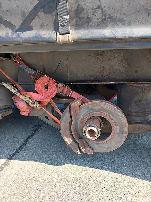 Policejní hlídky zastavily ve středu dopoledne na dálnici D2 kamion, který na zadním návěsu postrádal jedno kolo. Mířil ze Slovenska do Polska. (13. srpna 2025)