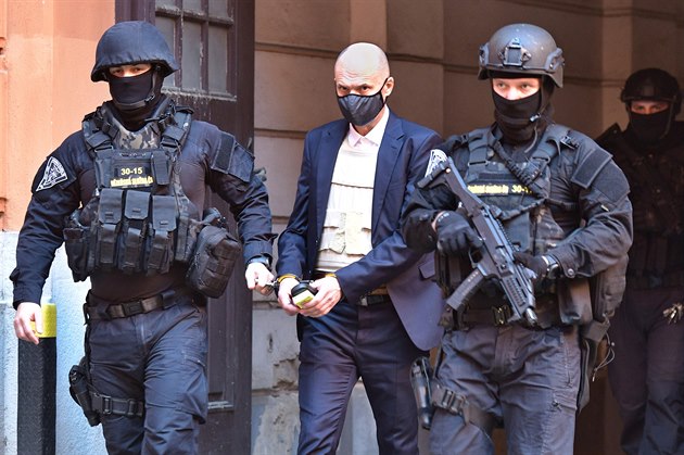 Jiřího Švachulu i tentokrát k soudu doprovázela ozbrojená eskorta policistů se samopaly. (5. listopadu 2020)