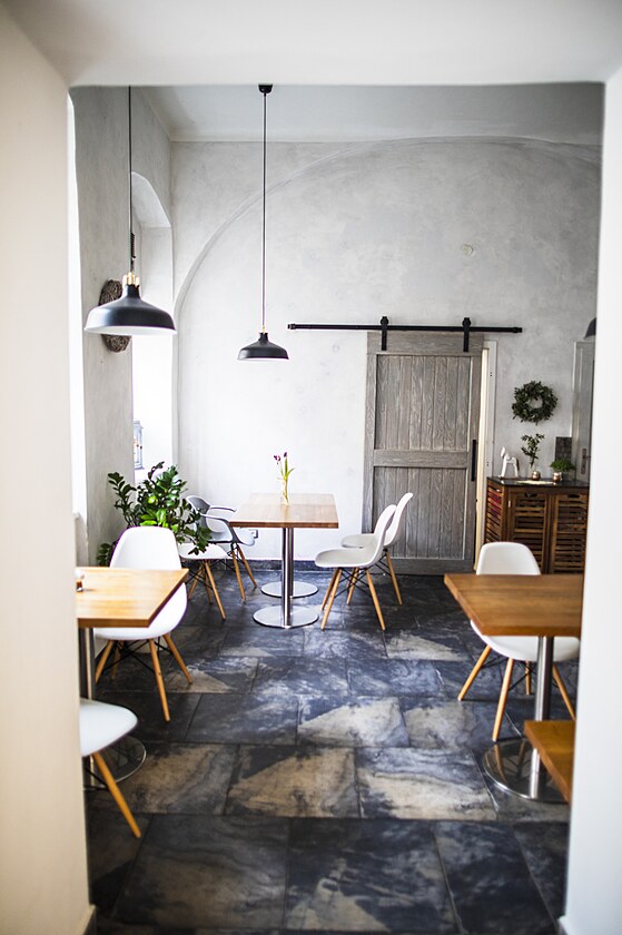 Interiér brněnské kavárny Cukrové nebe. Vlastní ji Iva Spasiuková s Jaroslavem Schimmerem. (květen 2025)