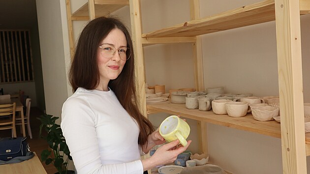 Eva Seitl tráví ve své brněnské keramické dílně Hlína srdcem veškerý volný čas včetně víkendů s dětmi. Na snímku drží první keramický výrobek, který vytvořila na kurzu.