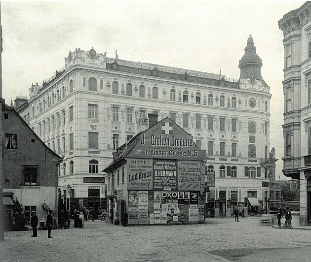 Dobová reklama v Kobližné odkazuje na nedalekou proslulou drogerii Jana Grolicha v Jánské ulici. V roce 1916 ji zničil rozsáhlý požár, který započal výbuchem benzinu v kuchyni.