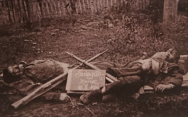 Četníci naaranžovali fotografii mrtvol Nikoly Šuhaje (vlevo) a jeho bratra Jury s překříženými puškami, nápisem Šuhajův konec a patřičným datem 16. 8. 1921.