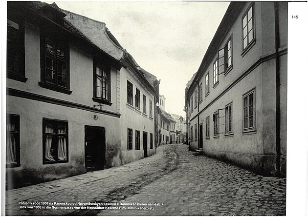 Pohled v roce 1908 na Panenskou ulici od Novoměstských kasáren k Dominikánskému náměstí