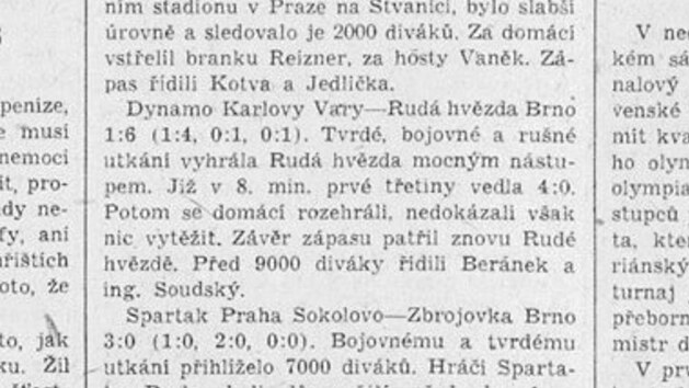 Když se pak měli Brňané představit v dalším kole doma proti Plzni, psala Lidová demokracie s respektem: „Po nečekaném vítězství Rudé hvězdy v Karlových Varech nad Dynamem v poměru 6:1 lze očekávat pěkný boj, poněvadž RH chce dokázat, že patří mezi nejlepší hokejové celky v republice.“