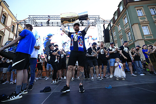 Hokejisté Komety Brno s Masarykovým pohárem pro vítěze extraligy při oslavě na Zelném trhu. (2. května 2025)