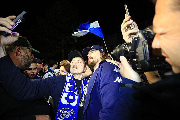 Příjezd mistrovských hokejistů Komety do Brna. Po návratu z Pardubic je přišlo přivítat na tisíc fanoušků. Na snímku s nimi Kristián Pospíšil. (30. dubna 2025)