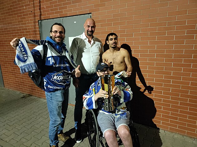 Majitel Komety Libor Zábranský se fotí s fanoušky po návratu z Pardubic, kde brněnské mužstvo vybojovalo mistrovský titul. (30. dubna 2025)