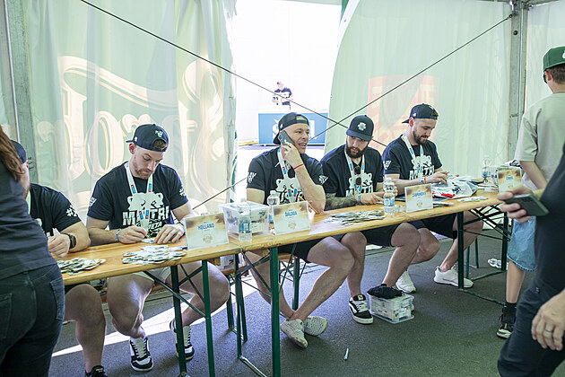 Hokejisté Komety Brno na autogramiádě s fanoušky po mistrovské sezoně. (2. května 2025)