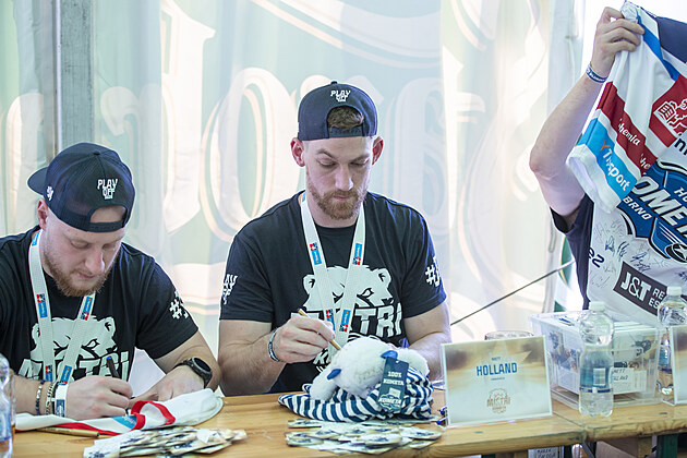 Hokejisté Komety Brno (zleva) Adam Zbořil a Rhett Holland na autogramiádě s fanoušky po mistrovské sezoně. (2. května 2025)