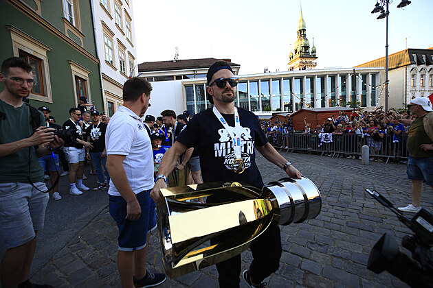 Kapitán hokejistů Komety Brno Jakub Flek s Masarykovým pohárem pro vítěze extraligy při oslavě na Zelném trhu. (2. května 2025)