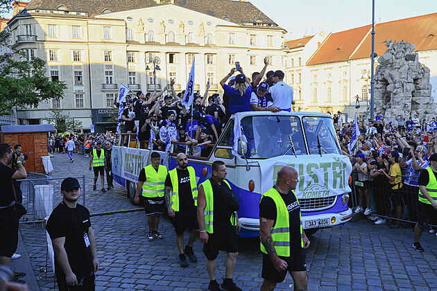 Hokejisty Komety Brno přivezl na oslavu vítězství v extralize na Zelný trh otevřený autobus. (2. května 2025)
