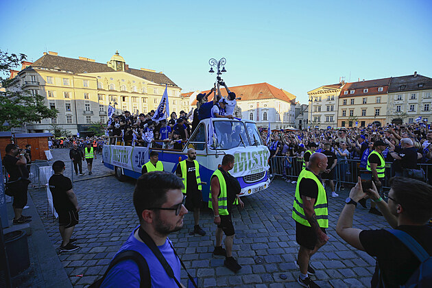 Hokejisty Komety Brno přivezl na oslavu vítězství v extralize na Zelný trh otevřený autobus. (2. května 2025)
