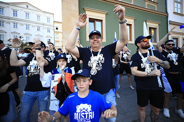 Trenér hokejistů Komety Brno Kamil Pokorný slaví s fanoušky na Zelném trhu extraligový titul. (2. května 2025)