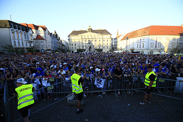 Zaplněný Zelný trh slavil s hokejisty Komety Brno extraligový titul. (2. května 2025)
