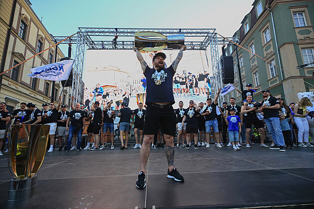 Hokejisté Komety Brno slavili na Zelném trhu extraligový titul. (2. května 2025)