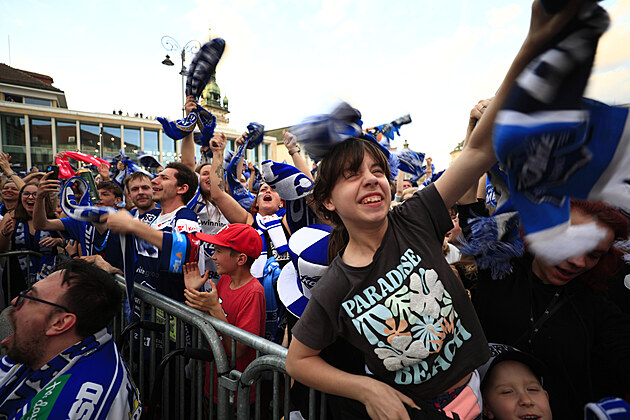 Fanoušci Komety Brno fandili při finále extraligy ze Zelného trhu. (25. dubna 2025)