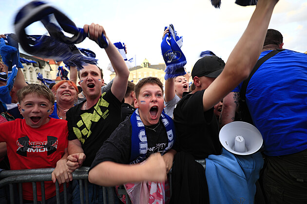 Fanoušci Komety Brno fandili při finále extraligy ze Zelného trhu. (25. dubna 2025)