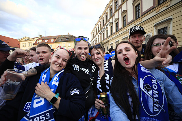 Fanoušci Komety Brno fandili při finále extraligy ze Zelného trhu. (25. dubna 2025)