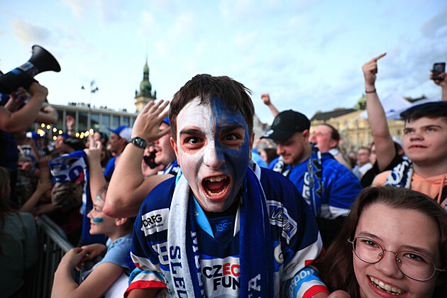 Fanoušci Komety Brno fandili při finále extraligy ze Zelného trhu. (25. dubna 2025)