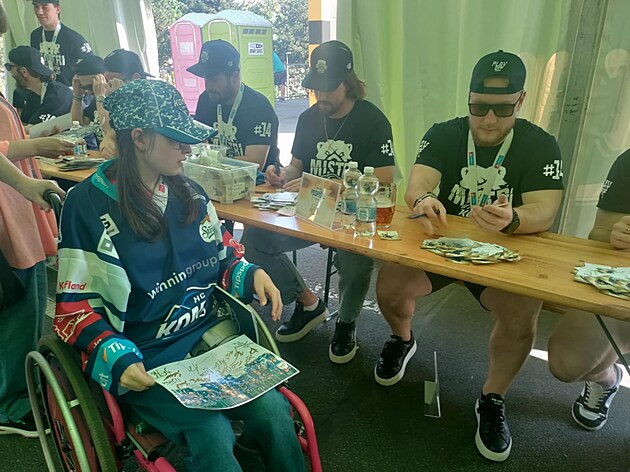 Vítězové hokejové extraligy z brněnské Komety se podepisují fanouškům v pivovaru Starobrno na Mendlově náměstí. (2. května 2025)