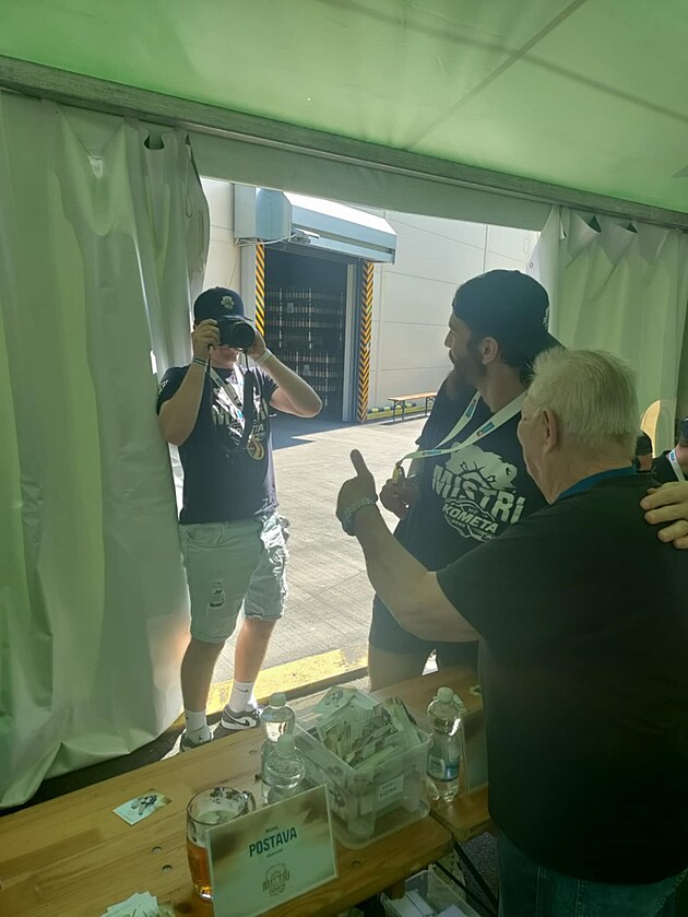 Vítězové hokejové extraligy z brněnské Komety se podepisují fanouškům v pivovaru Starobrno na Mendlově náměstí. Na snímku fotí brankář Michal Postava fanouška s Peterem Muellerem. (2. května 2025)