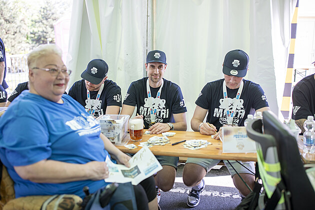 Vítězové hokejové extraligy z brněnské Komety se podepisují fanouškům v pivovaru Starobrno na Mendlově náměstí. (2. května 2025)