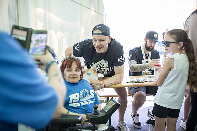 Vítězové hokejové extraligy z brněnské Komety se podepisují fanouškům v pivovaru Starobrno na Mendlově náměstí. (2. května 2025)