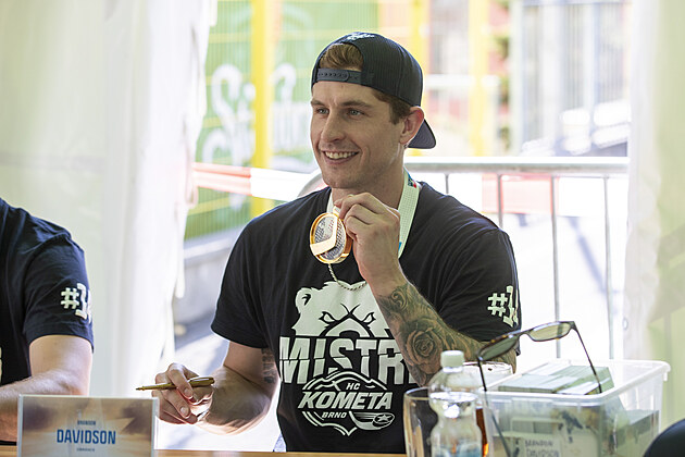 Vítězové hokejové extraligy z brněnské Komety se podepisují fanouškům v pivovaru Starobrno na Mendlově náměstí. (2. května 2025)