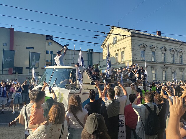 Krátce před 18. hodinou autogramiáda hokejové Komety skončila a autobus s hráči vyjel na Zelný trh. (2. května 2025)