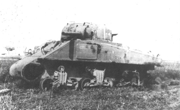 Tank Sherman M4A1 americké výroby ze sestavy 2. gardového mechanizovaného sboru (6. gardová tanková armáda), zničený 23. dubna 1945 na poli u Otnic.