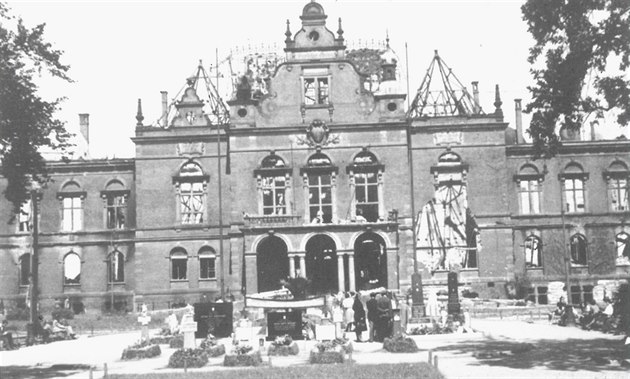 První provizorní hroby rudoarmějců před ruinami Německého domu.