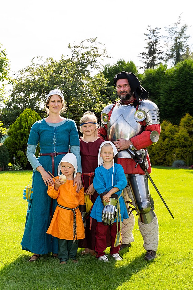 Manželé Gajdošíkovi z Heršpic na Vyškovsku mají zálibu ve středověku a tehdejším odívání. Jsou členy spolku Konůvky, který se stará o místo někdejší středověké osady poblíž jejich obce. Na snímku celá rodina.