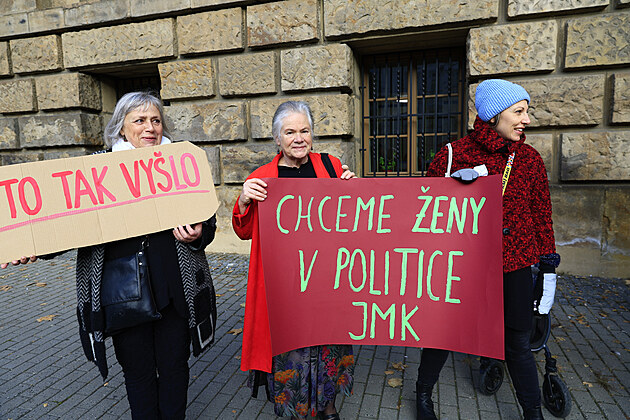 Asi stovka protestujících žen přišla na ustavující zastupitelstvo Jihomoravského kraje upozornit, že krajskou radu tvoří pouze muži. (4.11.2024)