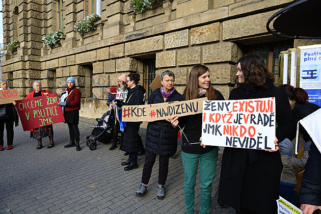 Asi stovka protestujících žen přišla na ustavující zastupitelstvo Jihomoravského kraje upozornit, že krajskou radu tvoří pouze muži. (4.11.2024)