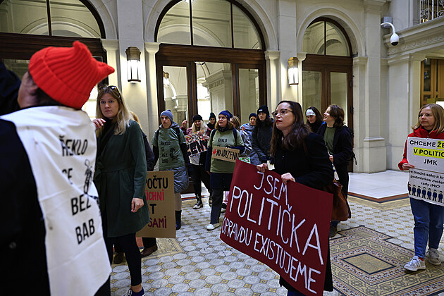 Asi stovka protestujících žen přišla na ustavující zastupitelstvo Jihomoravského kraje upozornit, že krajskou radu tvoří pouze muži. (4.11.2024)
