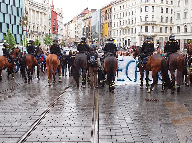 Policisté na koních, navíc v řadě, mají při rizikových akcích vzbuzovat respekt.