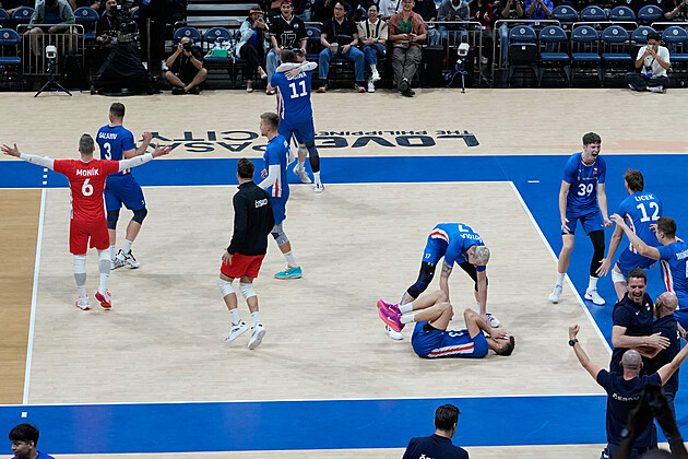 JAK SE SLAVÍ POSTUP. Antonín Klimeš (39) běží v ústrety Marku Lickovi, Marek Šotola zvedá ze země Patrika Indru a Milan Moník děkuje fanouškům.