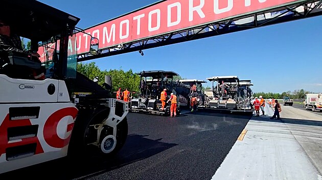 Za minutu vznikne 2,7 metrů nového asfaltu. „Musíme udržovat rychlost, protože každé zastavení znamená hrb na dráze,“ říká vedoucí stavby Igor Janča. V pátek dělníci dokončí dráhu od startu po první kilometr a čtvrt, v sobotu je čeká další kilometr a půl.