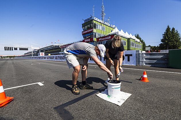 Na brněnském Masarykově okruhu finišují přípravy na motocyklovou Grand Prix. Mimo jiné se maluje startovní rošt. (14. července 2025)