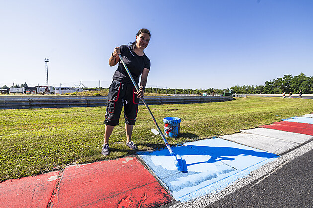 Na brněnském Masarykově okruhu finišují přípravy na motocyklovou Grand Prix. Natírání obrubníků je povinností. (14. července 2025)