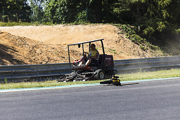 Na brněnském Masarykově okruhu finišují přípravy na motocyklovou Grand Prix. Areál brázdí i pracovníci se sekačkami trávy. (14. července 2025)